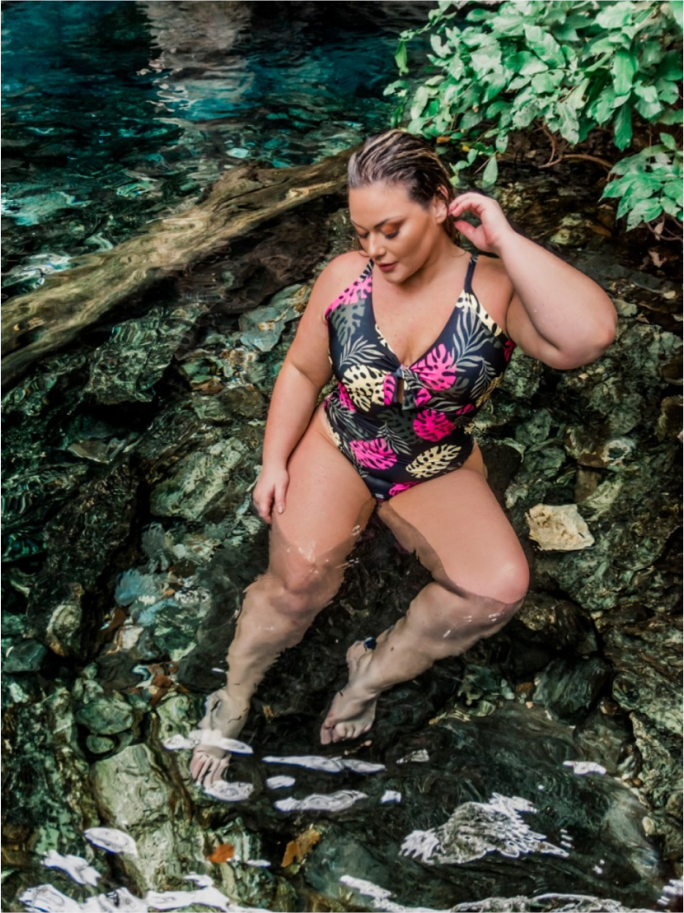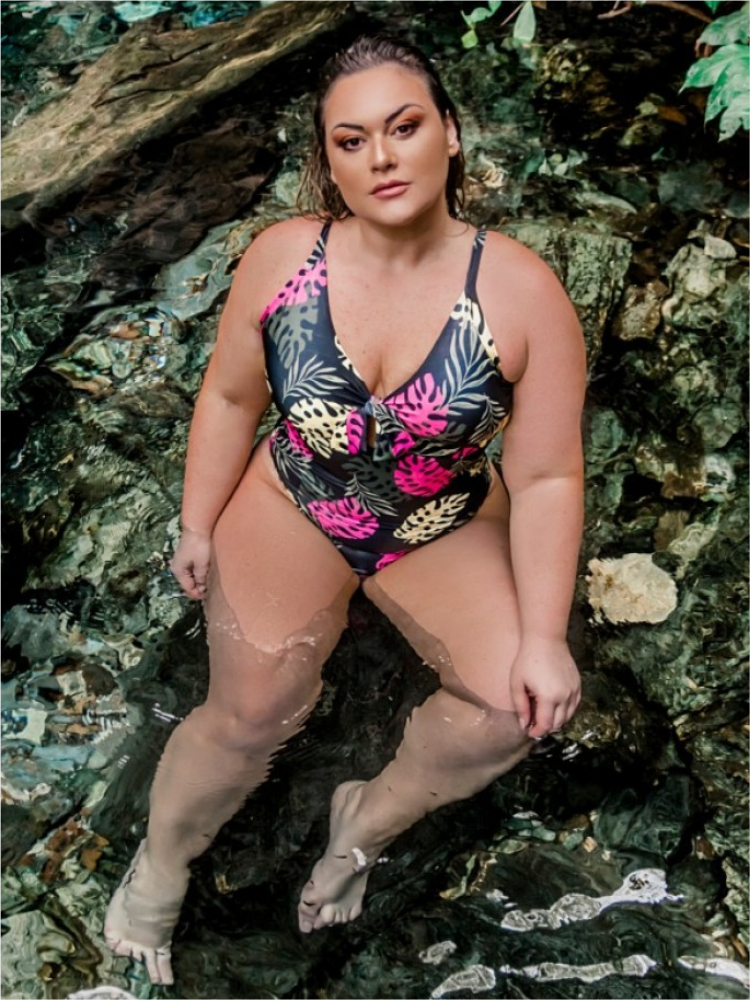 MAIÔ PLUS SIZE ANNA - Coleção Jalapão Beachwear - Maiô estampado com detalhe de amarração no decote e abertura nas costas - Composição - 90%Poliéster 10% Elastano Forro 100%Poliamida